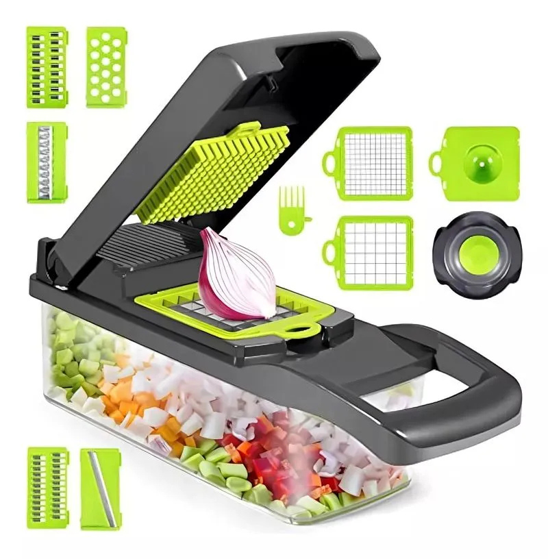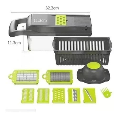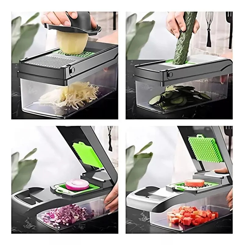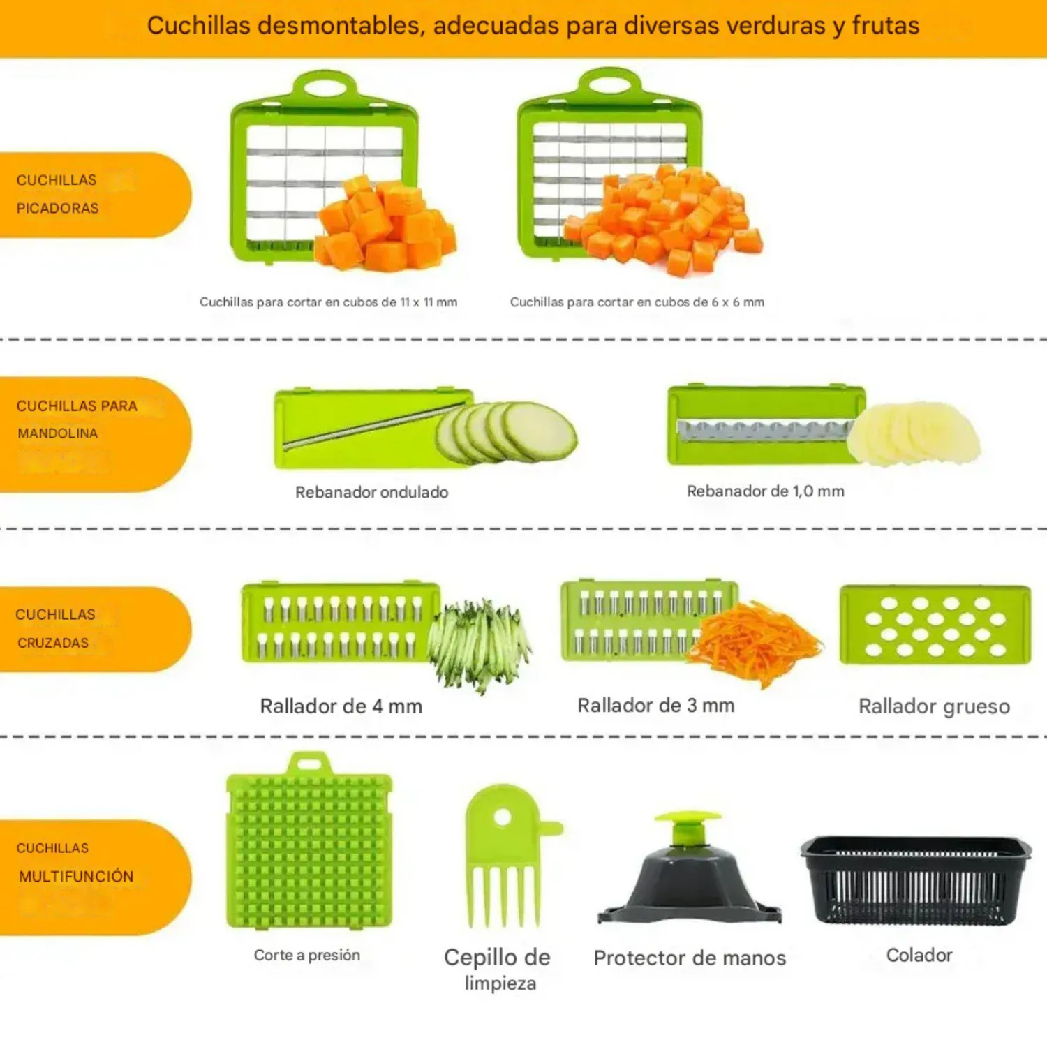 Organiza tu cocina y ahorra tiempo con un rebanador 14 piezas premium que corta, ralla, pica y lamina en segundos. Incluye cesta escurridora, contenedor y cuchillas intercambiables de acero inoxidable 304.